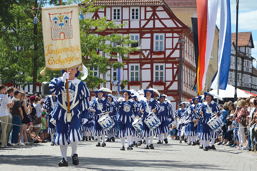 Markante Fanfaren und lautstarke Trommeln kündigen den Fanfarenzug Eschwege an.